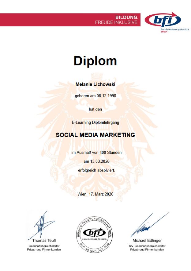 Melanie Lichowski, Dipl. Social Media Mangerin (BFI Wien) hat den E-Learning-Diplomlehrgang Social Media Marketing im Ausmaß von 400 Stunden erfolgreich abgeschlossen.